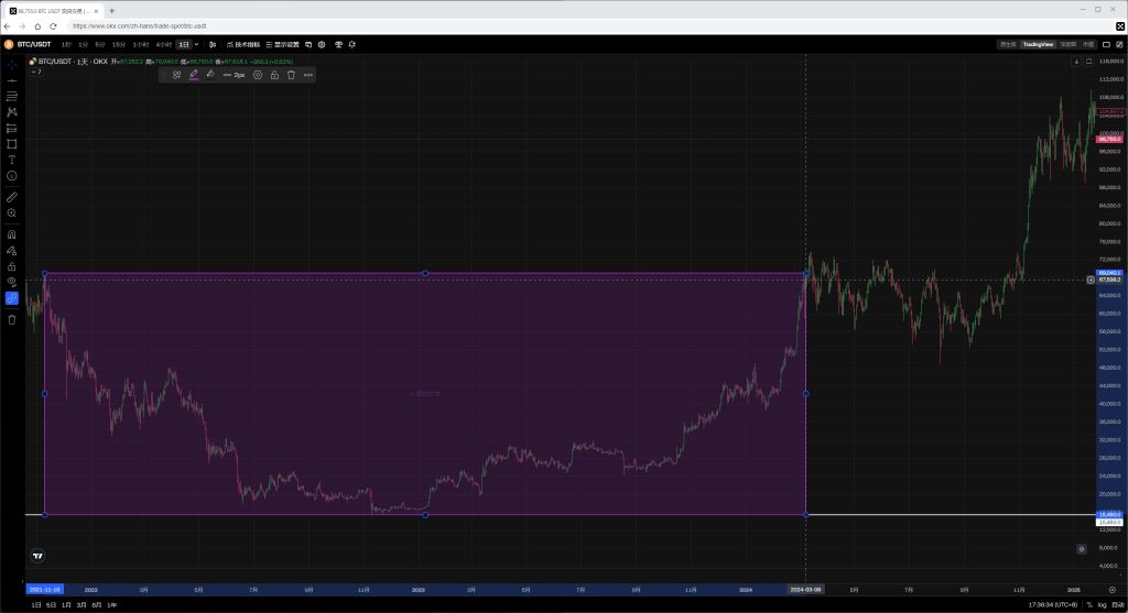 看着这些数据令人振奋,算起来三年时间也不算长。但没人能忍受那么大的亏损,特别是在市场处于最低点时。价格跌至30000元以下,持续了一年多,最终获得如此高的收益,正是因为在低价区间时间足够久,能够积累足够的低价筹码。站在“事后诸葛亮”的角度,谁都能说得头头是道,但真实的经历很少有人能坚持下来。